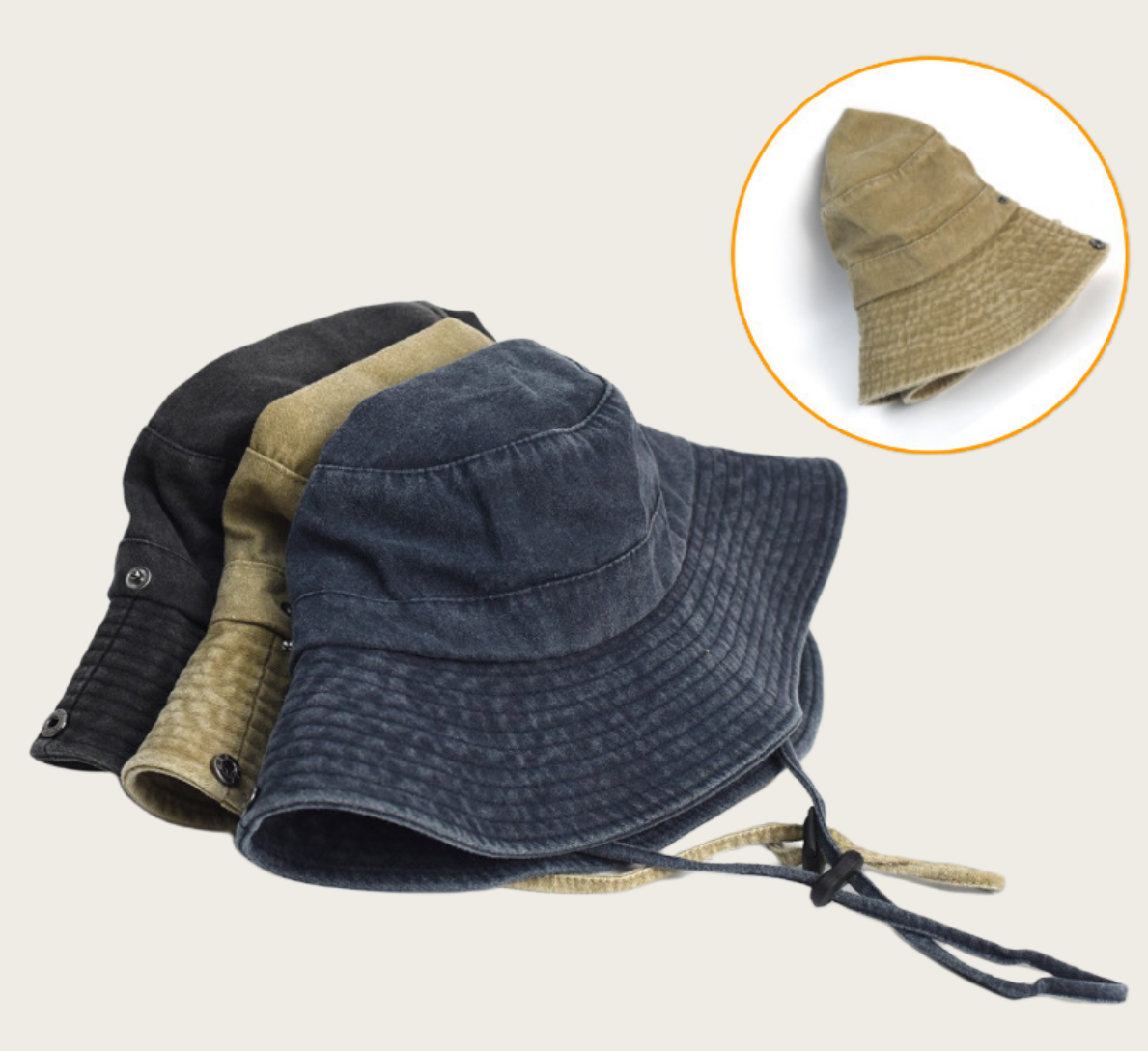 Multi-Style Washed Bucket Hat with Windproof Cord